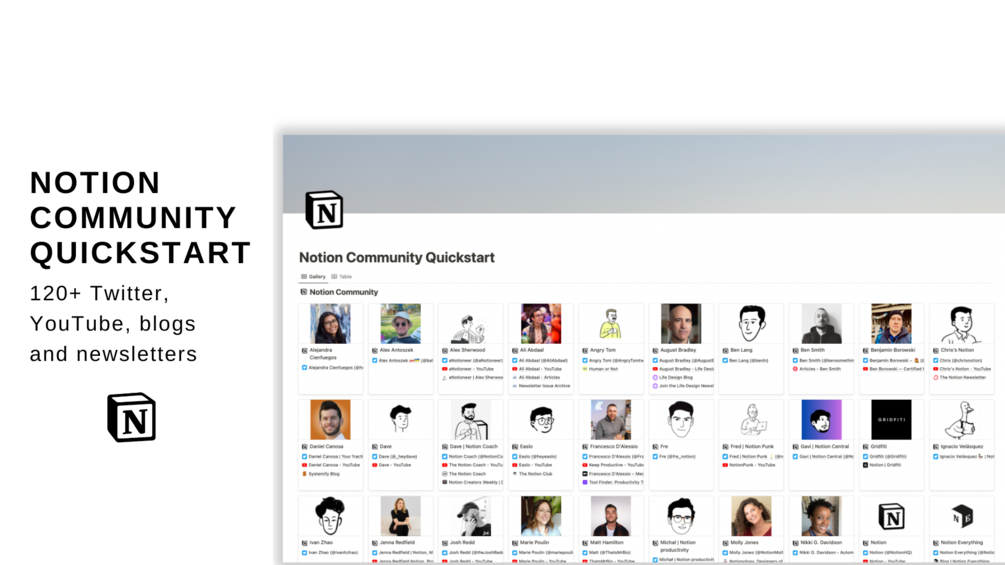 Notion Community Quickstart is a curated collection of over 120 Twitter accounts, YouTube channels, blogs, and newsletters that are all dedicated to sharing valuable insights and resources related to Notion. With Notion Community Quickstart, you'll have access to a wealth of knowledge at your fingertips, making it easier than ever to stay up-to-date on the latest trends, tips, and tricks for using Notion effectively.
